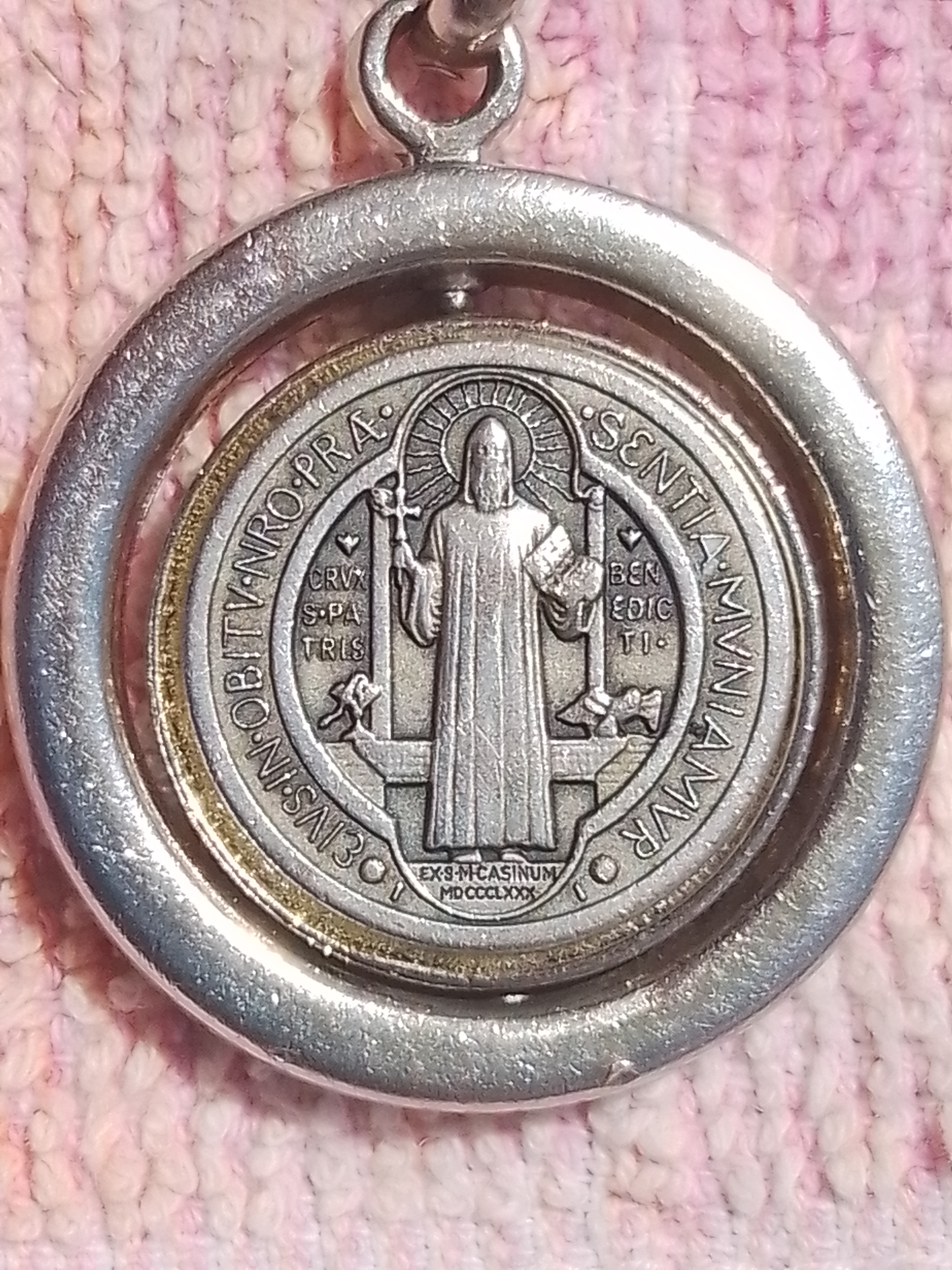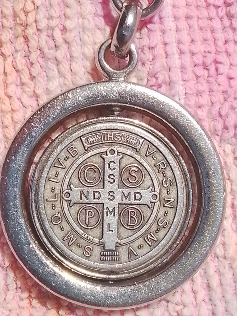 Qualche anno fa ho visitato il monastero del Sacro Speco e di Santa Scolastica a Subiaco e lì ho acquistato il portachiavi con la medaglia di San Benedetto delle foto qui sotto.