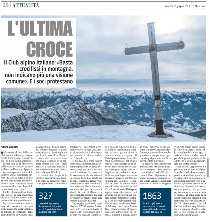 Capite come siamo ridotti? Un percorso interiore e insieme un’apertura alla bellezza del creato, questa è la montagna! E la croce è la meta da raggiungere, più che simbolo di una religione direi che essendo sulla cima indica il punto più alto dove può spingersi l’uomo con le proprie forze. Da lì in avanti c’è solo Dio, la trascendenza a creare un ponte con la nostra finitezza e si aprono una miriade di strade all’animo umano! Eppure c’è sempre chi vuole cancellare ogni speranza di salvezza, la roccia deve restare tale, dura, fredda, grigia e senza appigli, esattamente come la società in cui viviamo, senza futuro e ormai anche senza più passato!