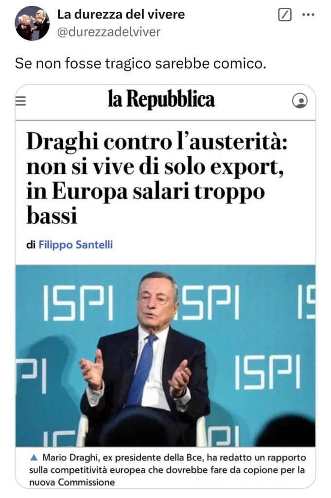 Quindi dopo anni di austerity volta alla compressione salariale e all’export, Draghi afferma che i salari sono troppo bassi!!!