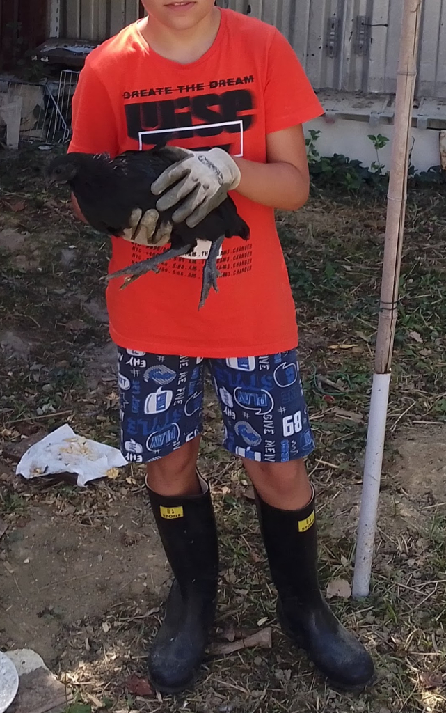Valentino ha in braccio un galletto Cemani di circa due mesi. Ben visibile è già un accenno di cresta!