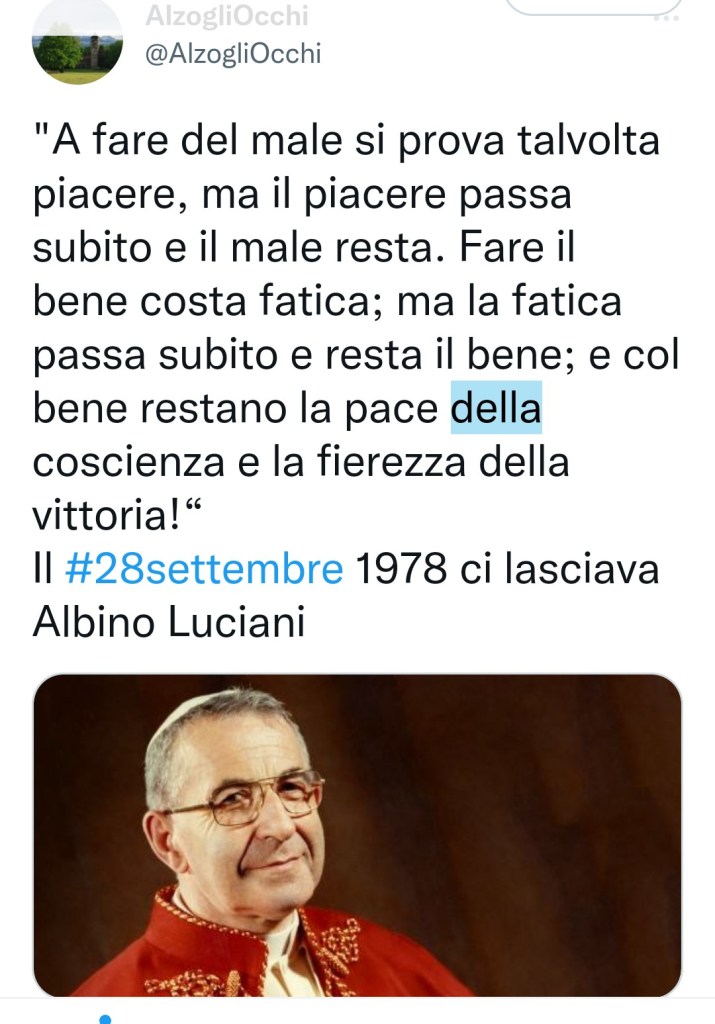 Oggi più che mai servirebbero cavalieri al servizio del bene, che marciassero fieri indossando l’armatura della pace. Essa è invincibile se viene difesa dalla Verità! Ma senza una vera fede luminosa a guidarci l’umanità non può che brancolare nella menzogna. Speriamo che le sagge parole di Papa Luciani risveglino le coscienze infondano il coraggio soprattutto a chi può decidere in un momento così difficile dove la guerra rischia di travolgerci con la sua insensatezza portatrice di morte