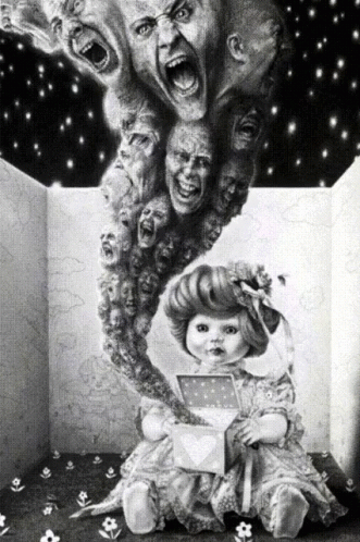 Un giorno che era sola, quasi senza accorgersene allungò la mano verso il coperchio del vaso e lo sollevò poco poco con l’unghia, ma non vide nulla. Allora lo aprì del tutto e dal vaso si levò come una nebbia in cui si intravedevano tre orribili fantasmi, che tesero verso di lei scarne braccia di scheletri.