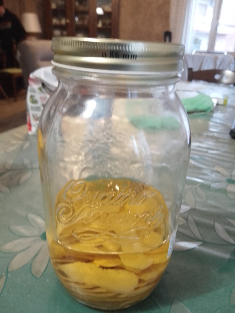 Partiamo dalla prima foto, un mese fa ho messo a macerare in 500ml di alcool le bucce di 4 limoni. Naturalmente devono essere limoni con buccia edibile, belli e profumati. Molto importante è togliere con pazienza la parte interna della buccia, cioè quella bianca che renderebbe il limoncello amaro e meno gradevole. Le bucce devono rimanere nell’alcool per almeno 30 giorni in modo che esso estragga al meglio le loro essenze.