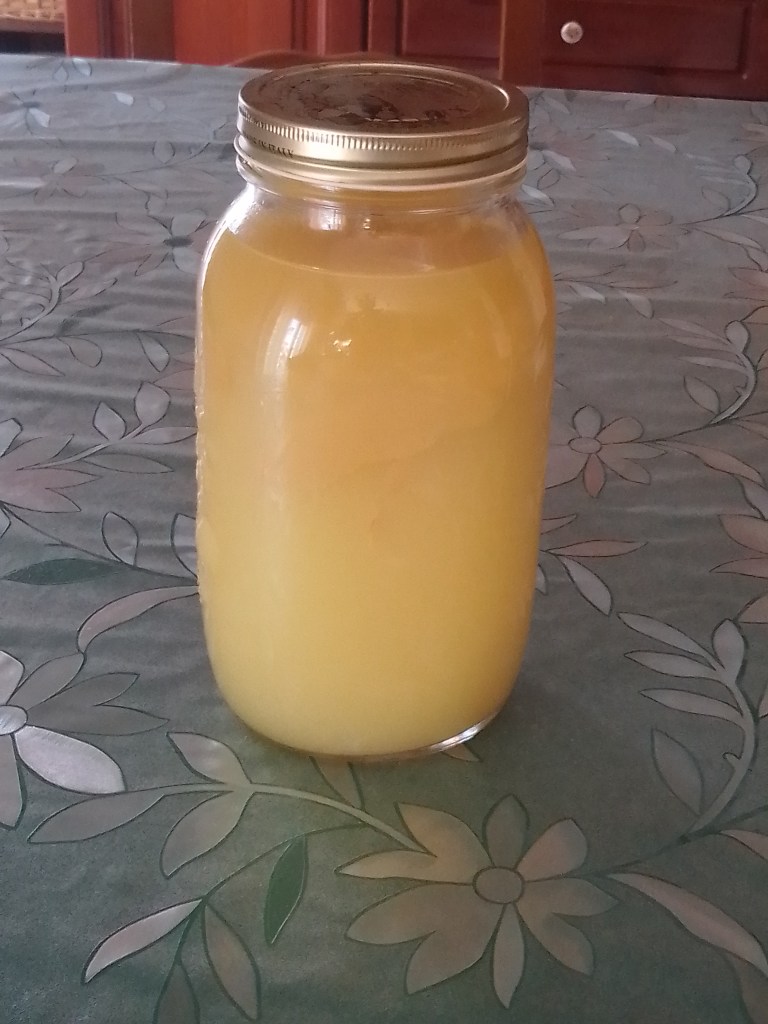 La soluzione d’acqua e zucchero va fatta raffreddare e poi potete aggiungervi il contenuto del barattolo con alcool e bucce comprese.